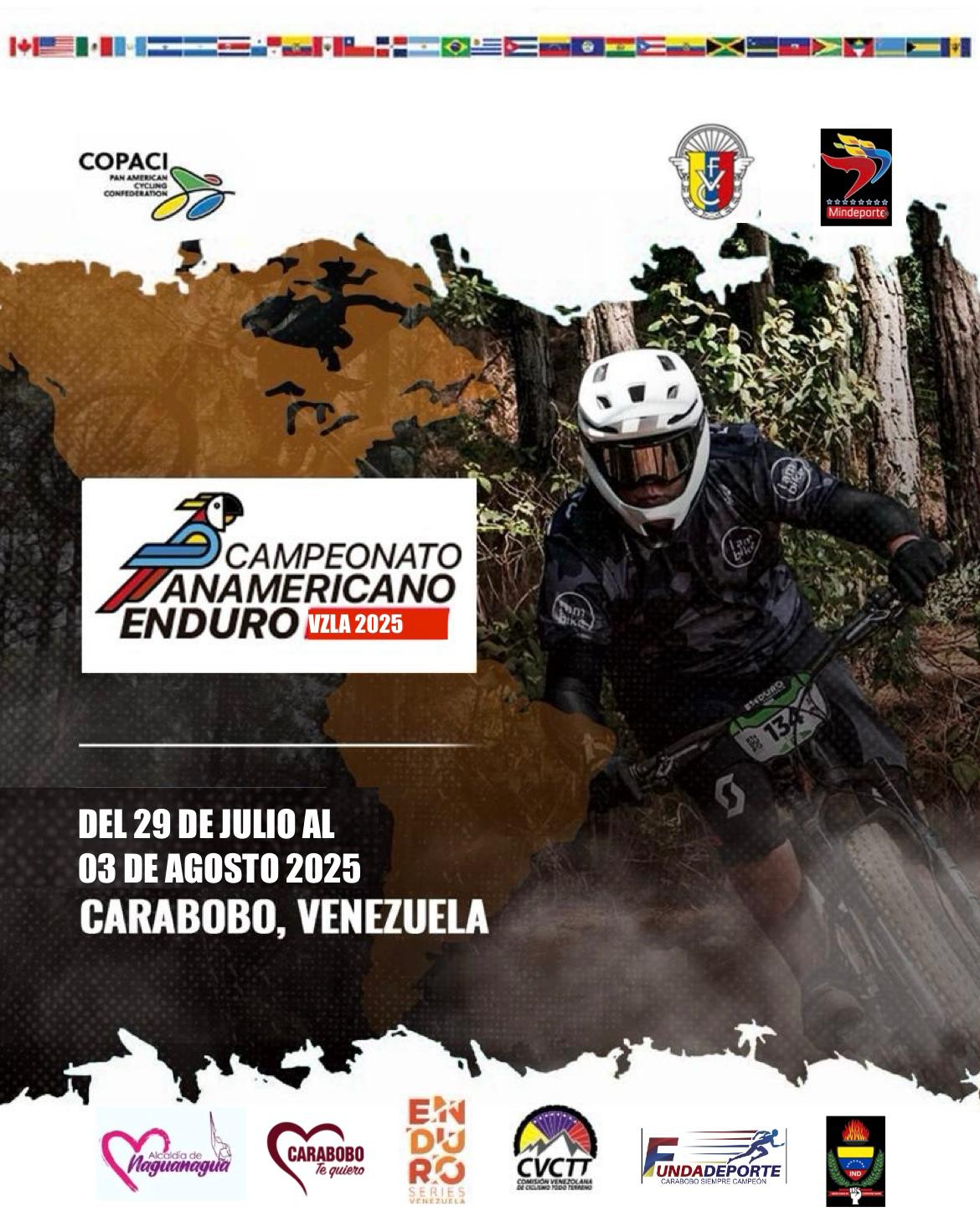 La Federación Venezolana de Ciclismo junto con la Organización Enduro Series Venezuela tienen el placer de invitar a todas las Federaciones Nacionales del Continente Americano pertenecientes a la Confederación Panamericana de Ciclismo (COPACI) y que hemos sido favorecidos para llevar a cabo el Campeonato Panamericano de Enduro MTB del 2025 el cual se estará desarrollando entre el 07 y el 12 de Octubre en la Ciudad de Naguanagua, Edo. Carabobo, Venezuela. Este gran evento en las que los Competidores de las Delegaciones de los diferentes países del continente pondrán a prueba sus habilidades de manejo en pruebas especiales por las pistas más técnicas del país en las Montañas de El Cerro el Café y Tazajal para definir así los campeones de América en las categorías de la Especialidad.